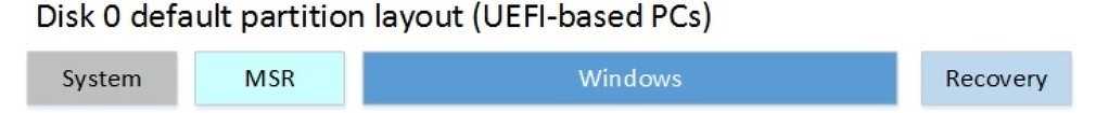 Согласно документации Microsoft, при разметке системного диска перед установкой Windows 10 последовательность разделов в соответствующей таблице должна быть следующей: системный или EFI; MSR; Windows; Recovery.