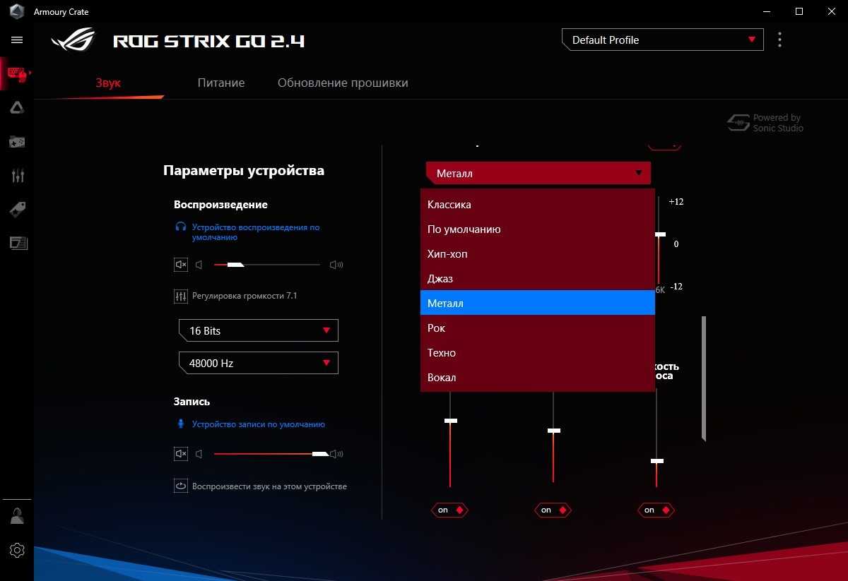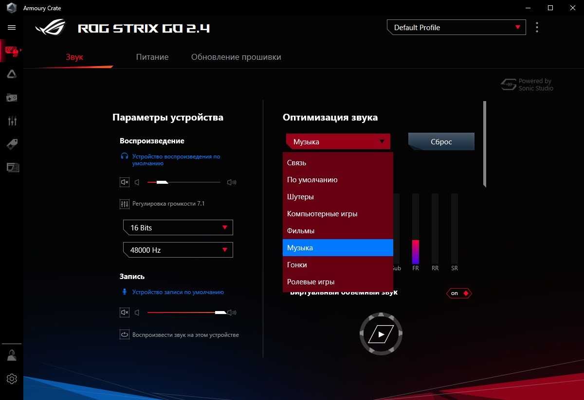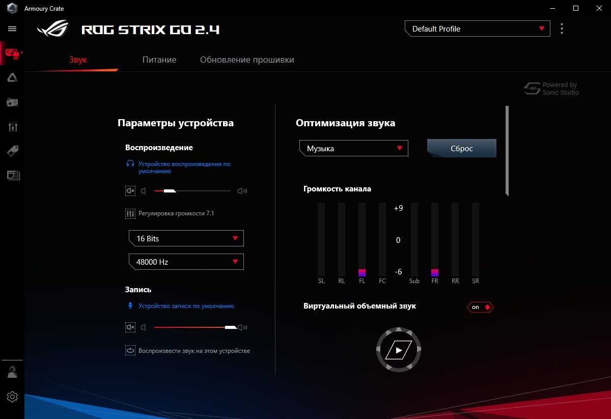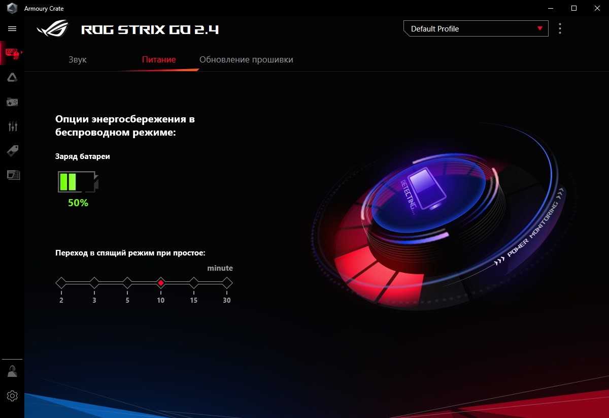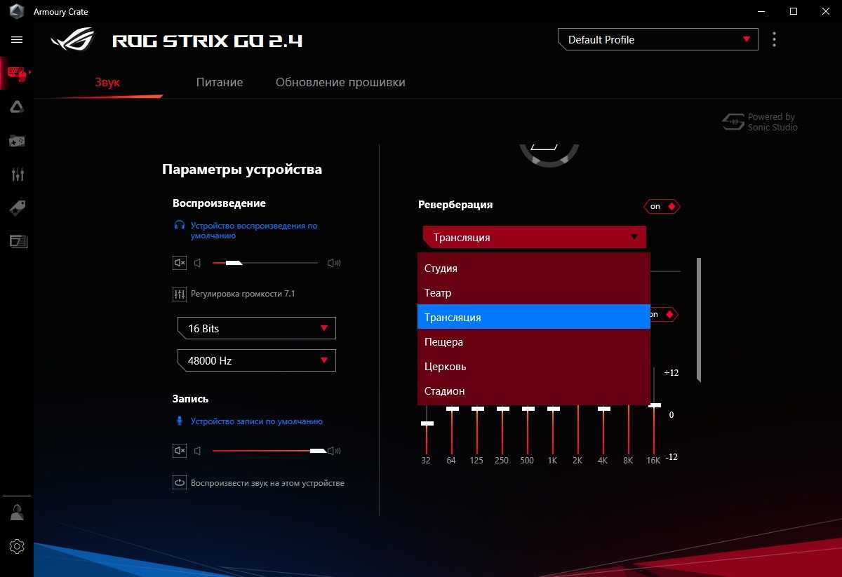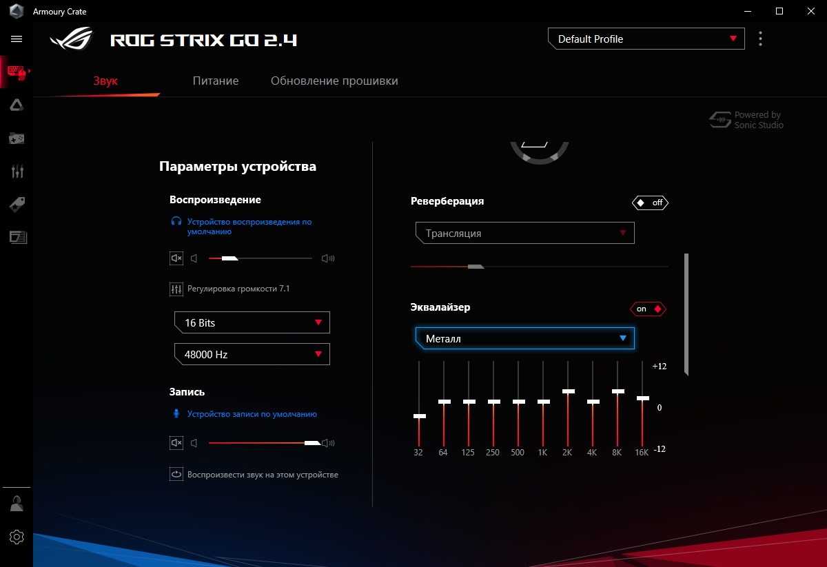 В фирменной утилите Armoury Crate можно поменять частоту дискретизации, выбрать пресет оптимизации звука под одну из задач, выбрать эффект реверберации и отрегулировать его уровень, выбрать пресет в эквалайзере, включить виртуальный объемный звук, установить степень усиления басов, компрессора и четкости голоса, а также вручную настроить шумоподавление, если интеллектуальное по каким-либо причинам вас не устраивает. В отдельных вкладках приложения можно посмотреть уровень заряда аккумулятора, выбрать время отключения наушников при простое (от 2 до 30 минут) и обновить прошивку.