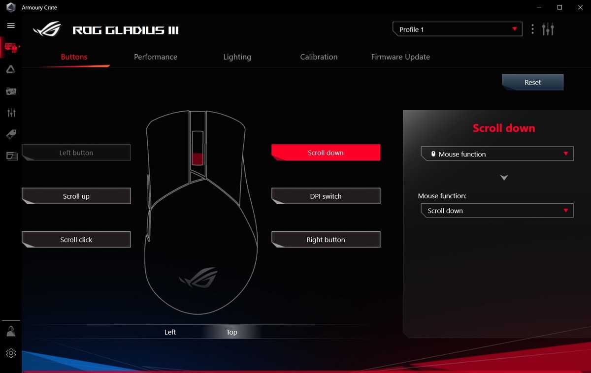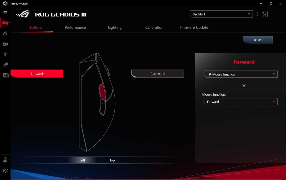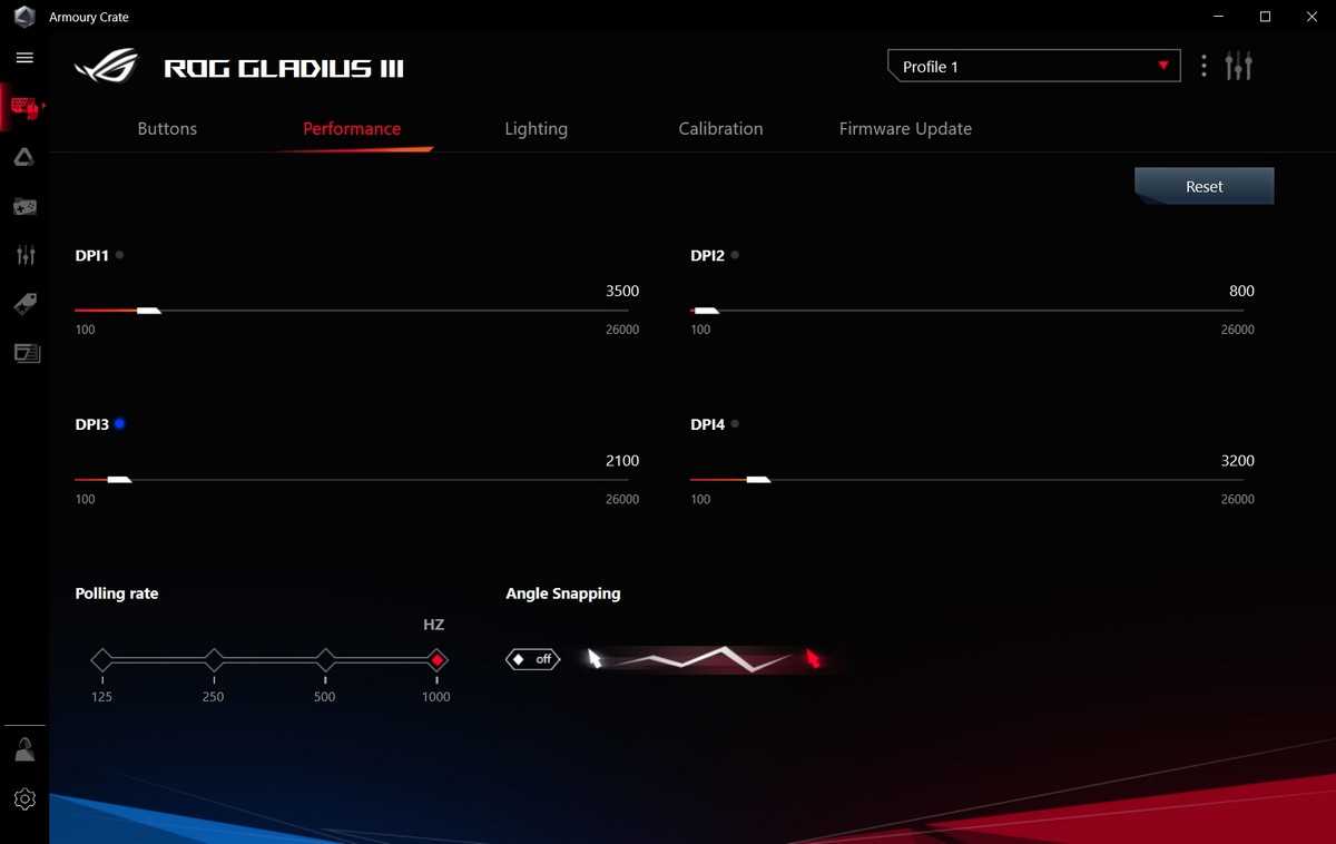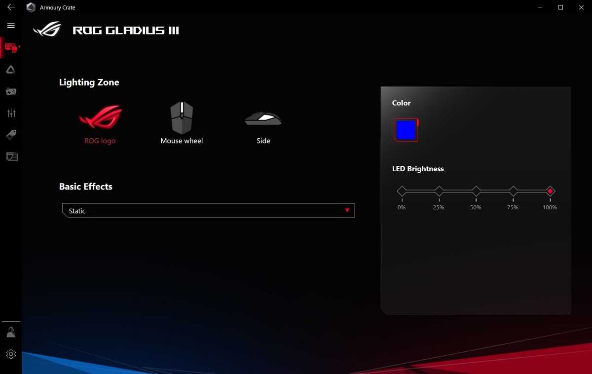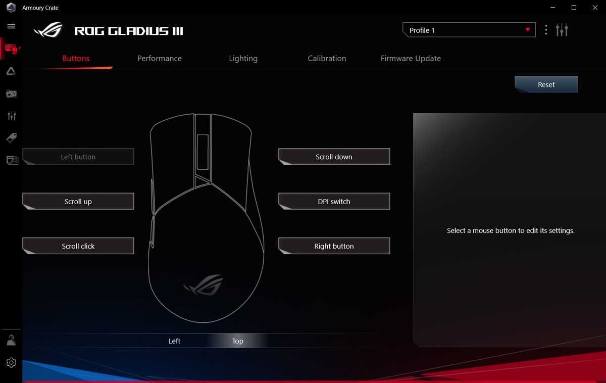 Настроить мышь, переназначить кнопки, выбрать подсветку и совершить все прочие привычные действия с устройством можно используя фирменную утилиту от ASUS под названием Armoury Crate. С ней мы уже очень давно и хорошо знакомы, но стоит ввести в курс дела тех, кто, возможно, видит её впервые. Всё меню настроек ASUS ROG Gladius III разделено на пять основных вкладок, плюс в верхней части есть раскрывающийся список из пяти профилей.