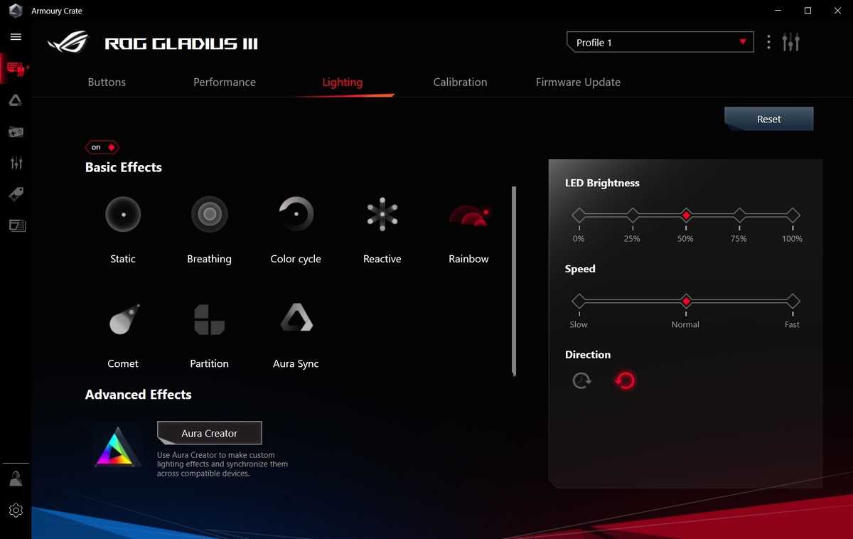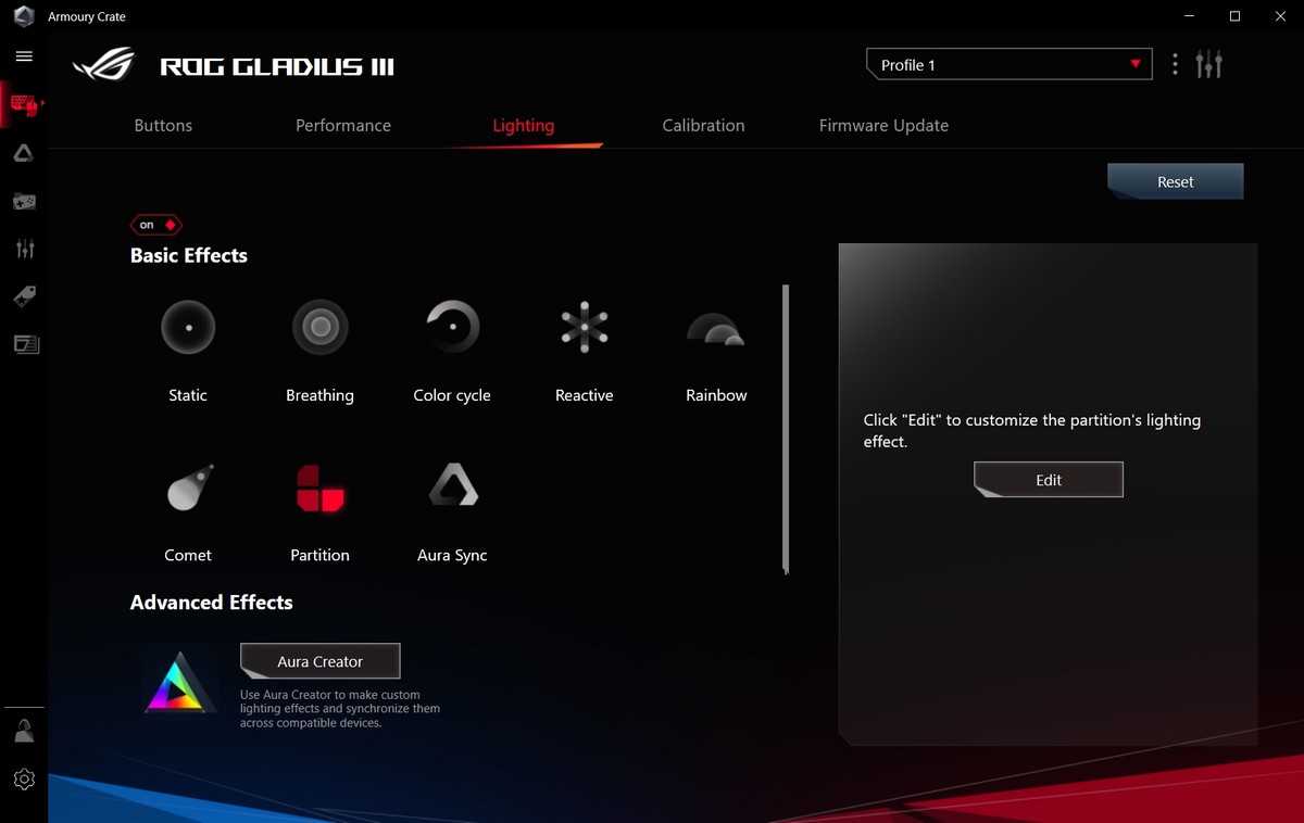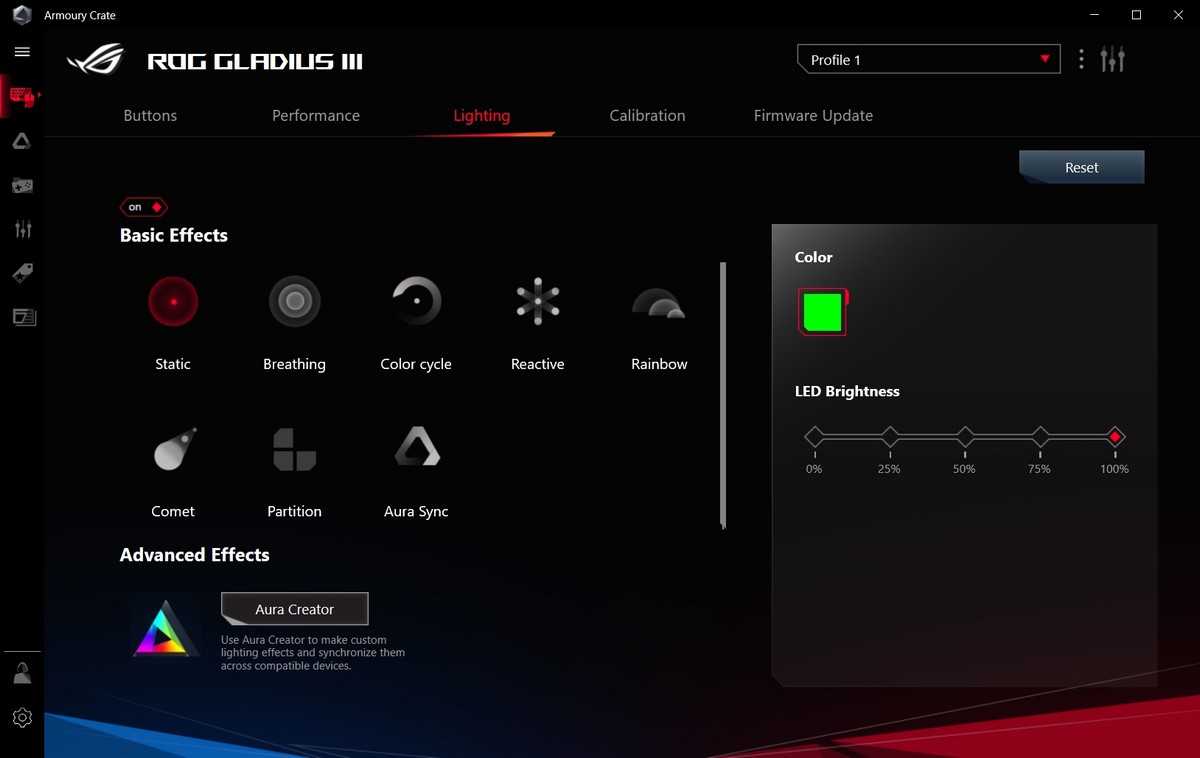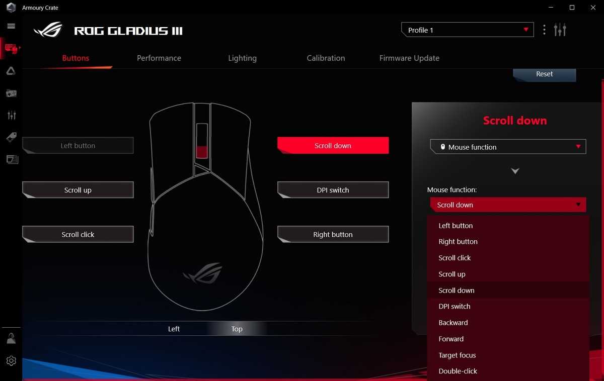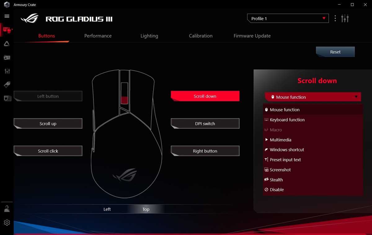 Настроить мышь, переназначить кнопки, выбрать подсветку и совершить все прочие привычные действия с устройством можно используя фирменную утилиту от ASUS под названием Armoury Crate. С ней мы уже очень давно и хорошо знакомы, но стоит ввести в курс дела тех, кто, возможно, видит её впервые. Всё меню настроек ASUS ROG Gladius III разделено на пять основных вкладок, плюс в верхней части есть раскрывающийся список из пяти профилей.