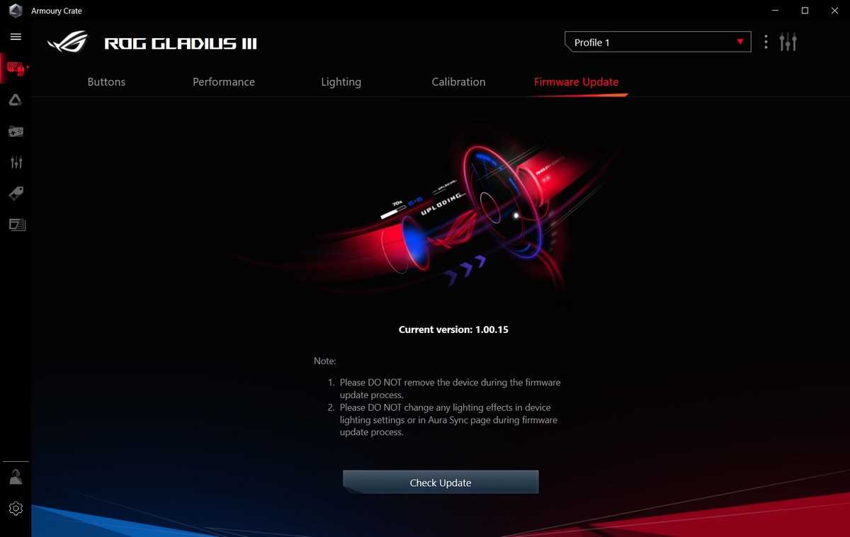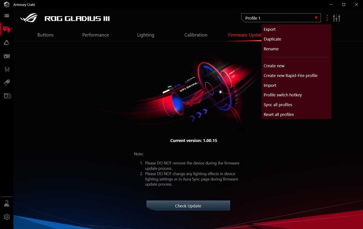 Четвертая вкладка содержит функции калибровки сенсора, где можно либо выбрать известную игровую поверхность (в основном от ASUS) и настроить расстояние отрыва, либо же вручную откалибровать мышь на какой-то конкретной поверхности. В последней вкладке — просто обновление прошивки. Снова же профили — их можно экспортировать, дублировать, переименовывать. Настройки каждого профиля независимы от других и они сохраняются во встроенную память мышки, а переключаться между ними можно используя соответствующую кнопку снизу у сенсора.