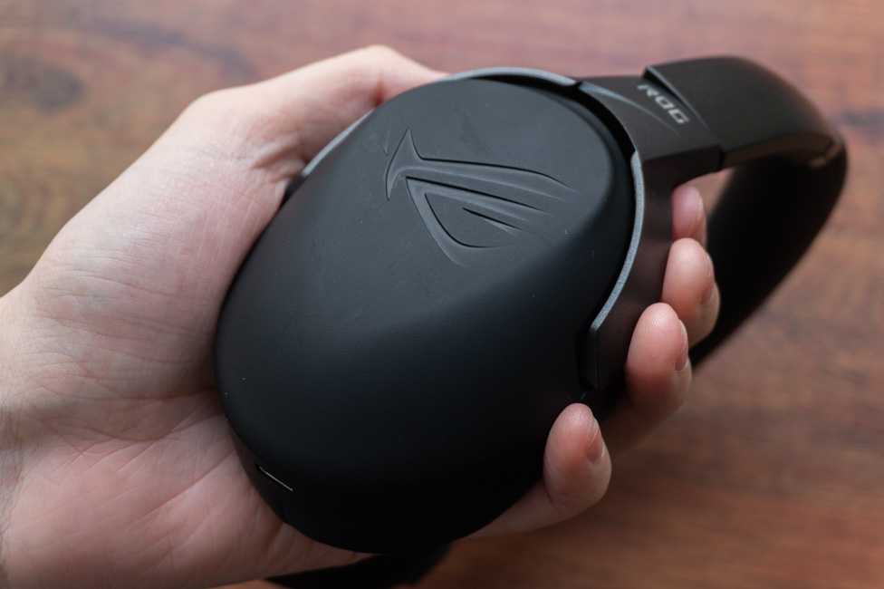 На внутренней стороне в месте креплений чаш к оголовью есть маркировки L и R. Сами крепления чашек на той же внутренней стороне имеют глянцевые тиснения с логотипом ASUS. Снаружи — серебристые логотип и надпись ROG, на правой и левой сторонах соответственно. Также стоит отметить, что с наружной стороны эти крепления чаш окрашены в темно-серый, а не черный цвет.