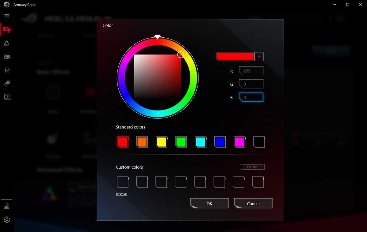 Во второй настраивается производительность мыши: значения DPI для четырех заготовок (от 100 до 26000), частота опроса (от 125 до 1000 Гц), активируется угол привязки. Третья вкладка полностью посвящена подсветке и содержит несколько основных эффектов: статический, дыхание цветовой цикл, реактивный, радуга, комета, раздел и Aura Sync. В зависимости от выбранного эффекта, будут доступны настройки смены цвета, направление и яркость подсветки. Кроме того, предпоследний режим позволяет самостоятельно настроить подсветку каждой из зон (логотип, колесо, боковая сторона). В таком случае доступных эффектов будет чуть меньше, но цвета и яркость сменить получится.