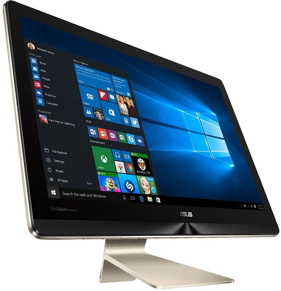 В ASUS делали ставку не только на техническую часть, но и на внешний вид. Темно-синий корпус моноблока с окантовкой цвета розового золота смотрится весьма эффектно. А благодаря тому, что все системные компоненты размещены в подставке, дисплей удалось сделать очень тонким.