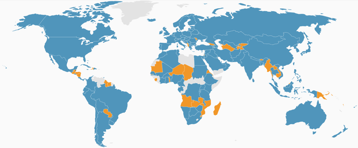 Государства-члены (синим) и члены-корреспонденты (оранжевым) ISO