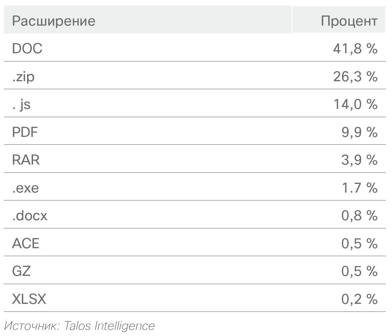 В том, что касается вредоносных программ и эксплойтов, аналитики напоминают: времена, когда инфекцию рассылали в виде исполняемых файлов, давно прошли. Злонамеренное вложение сегодняшнего дня — это файл в формате DOC (примерно 42% случаев). Стоит также остерегаться формата PDF и других разновидностей офисных документов. Вторыми по распространенности оказались архивы (в первую очередь — ZIP, по понятным причинам), но, к сожалению, в отчете не указано, какие данные находились внутри.
