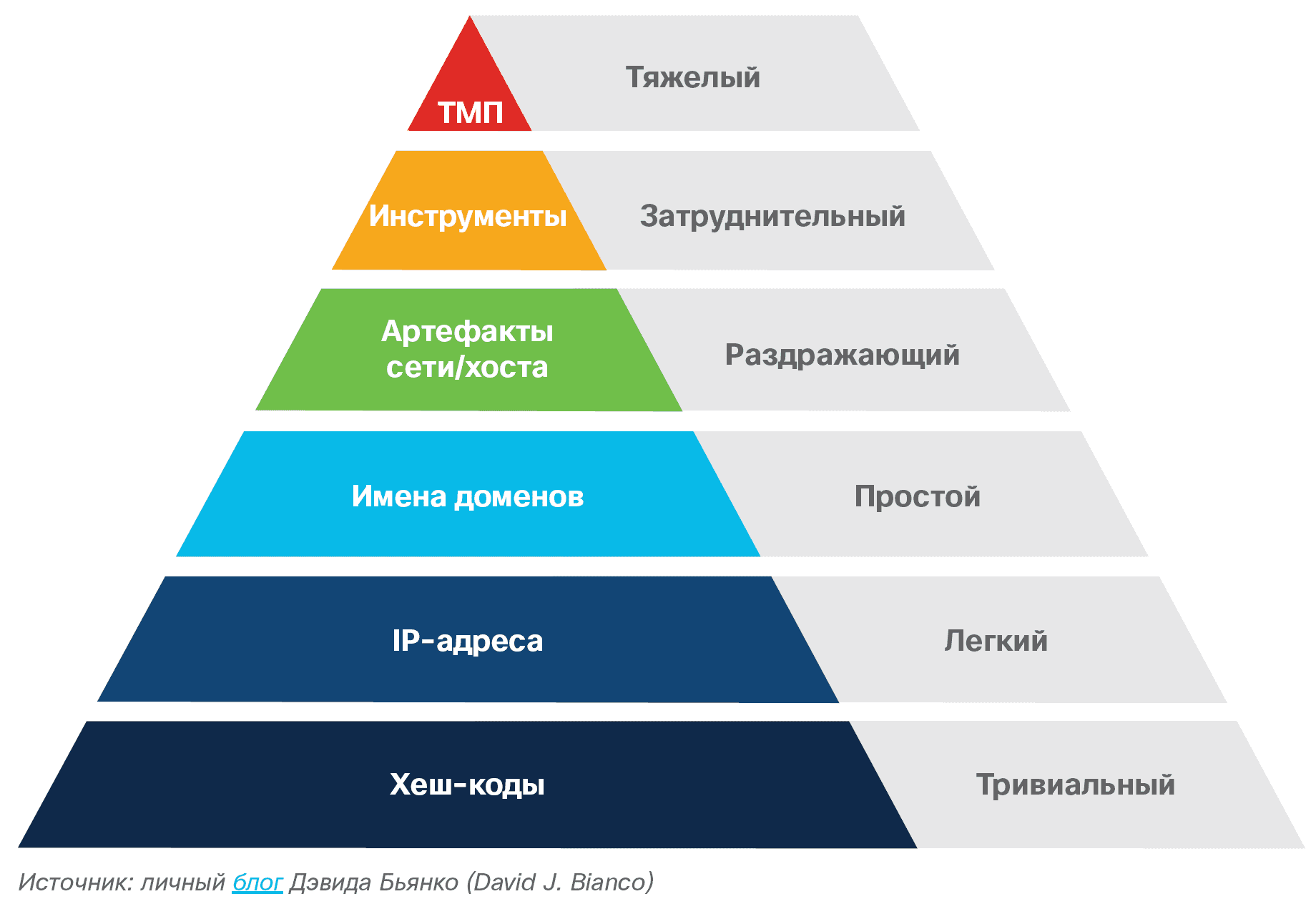 Рисунок 6. «Пирамида боли»: активы злоумышленника по уровням проблематичности их замены (ТМП — тактики, методы и процедуры)