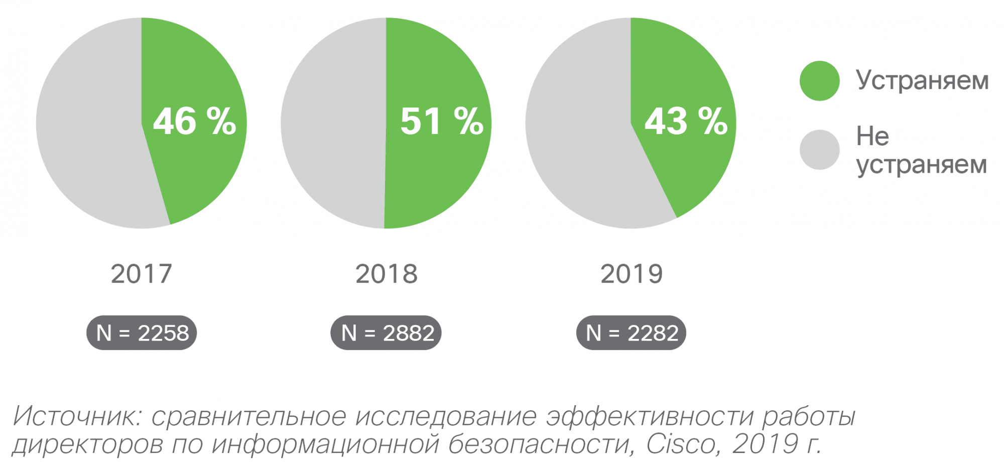В типовом случае ИБ-директор и его отдел получают до 10 000 предупреждений в день и реагируют примерно на половину поступивших уведомлений. При этом в 2019 году, по словам респондентов, менее четверти (24%) предупреждений были связаны с реальными угрозами. Примерно 43% таких обоснованных сообщений стали поводом для мер по устранению или исправлению проблемы; получается, что в среднем где-то 1 000 — 1 500 уведомлений, свидетельствующих об угрозе безопасности, каждый день остаются без внимания (не считая той половины «алертов», которую специалисты вообще не успевают исследовать). В связи с этим Cisco рекомендует применять специальные инструменты для обработки событий и предупреждений.