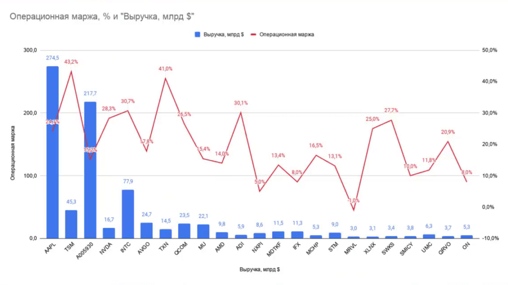 Самая высокая операционная маржа в секторе у TSMC — 43%. Также высокой маржой отличаются: