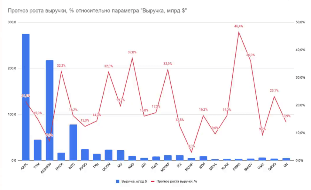По росту выручки самый высокий прогноз у компании Skyworks Solutions — 46%. Рост более 30% ожидается у следующих компаний: