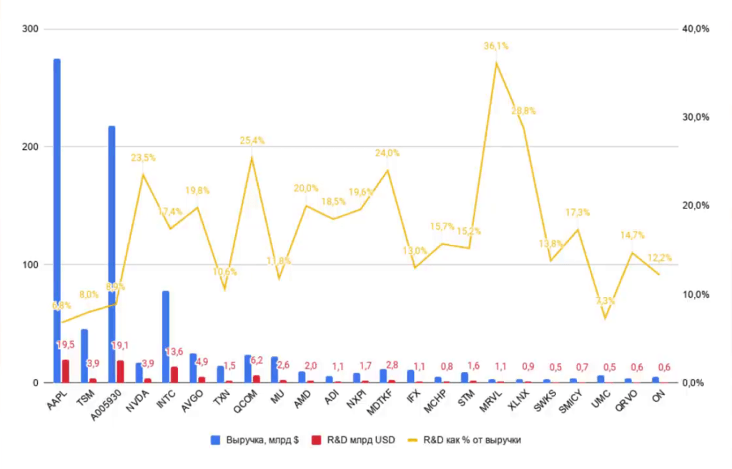 Одним из важнейших финансовых показателей компаний из сектора полупроводников являются затраты на исследования и разработки (R&D). Больше всех в этом бизнесе тратят: