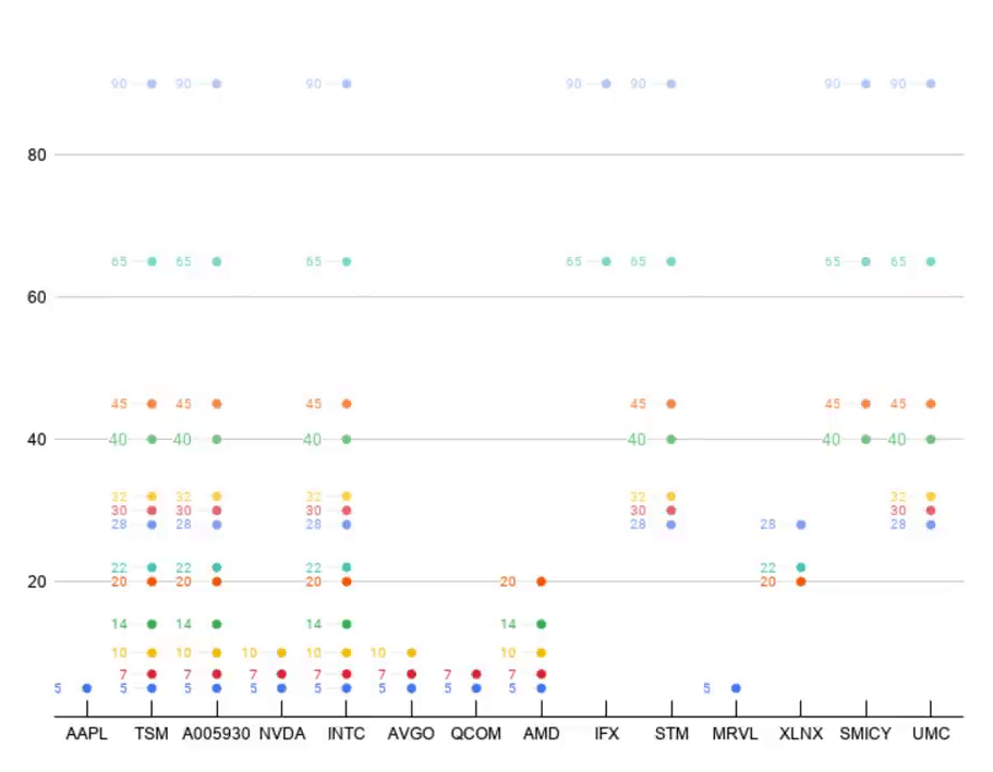 Компания имеет самый широкий ассортимент полупроводников. Она производит чипы от 5 до 90 нанометров.