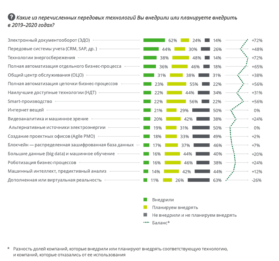 Почти половина компаний (43–46%) планирует внедрить большие данные, роботизацию бизнес-процессов и искусственный интеллект, хотя на текущий момент они встречаются в производственном секторе достаточно редко — только у 14–16% компаний. Также промышленные предприятия планируют внедрять умное производство (56%), полностью автоматизировать бизнес-процессы (55%) и использовать технологии энергосбережения (48%).