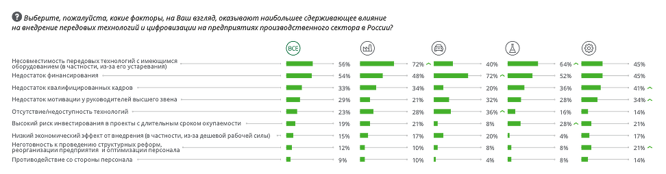 Наибольшее сдерживающее влияние на внедрение передовых технологий и цифровизацию на предприятиях производственного сектора, по мнению респондентов, оказывает несовместимость передовых технологий с имеющимся оборудованием (56%) и недостаток финансирования (54%). Значимыми факторами, которые выбрали почти треть респондентов, оказались также проблемы с персоналом, такие как недостаток квалифицированных кадров (33%) и недостаток мотивации у руководителей высшего звена (29%).