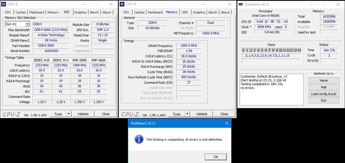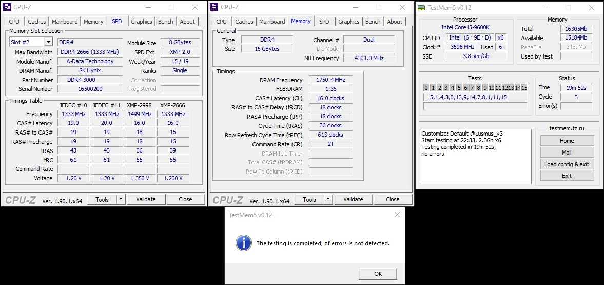 В первом случае лимитирующей планкой стала частота 3500 МГц, что само по себе уже было неплохо. Не меняя основные тайминги и лишь увеличив напряжение до 1.37 В, мы стабилизировали работу модулей XPG Hunter DDR4-3000 за счет увеличения tRFC до значения 613. При этих условиях модули памяти XPG Hunter DDR4-3000 успешно проходили проверку в стресс-тесте TestMem5 v0.12 @1usmus_v3.