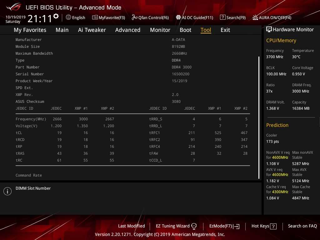 А такую информацию о модулях памяти XPG Spectrix D60G DDR4-3000 отображает BIOS материнской платы ASUS ROG Strix Z390-E Gaming.