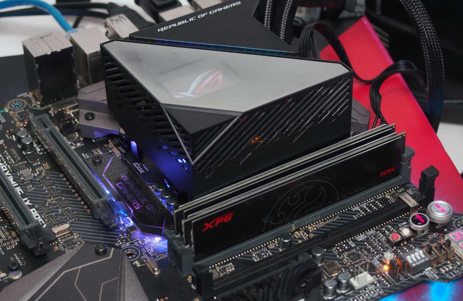 Модули памяти XPG Hunter DDR4-3000 отлично вписались в общую картину тестовой сборки. Черные брутальные радиаторы и яркие красные надписи — это то, что надо для компонентов серии «Republic of Gamers».