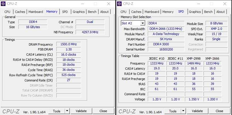 Используя XMP 2.0, оперативная память XPG Hunter DDR4-3000 работает «из коробки» на частоте 3000 МГц с таймингами 16-20-20-38 и напряжении 1.35В. До определения ее оверклокерского потенциала было поставлено два вопроса: на какой максимально частоте эта память сможет работать с «родными» для нее таймингами, а также на какой максимально частоте сможет работать при более высоких значениях таймингов?