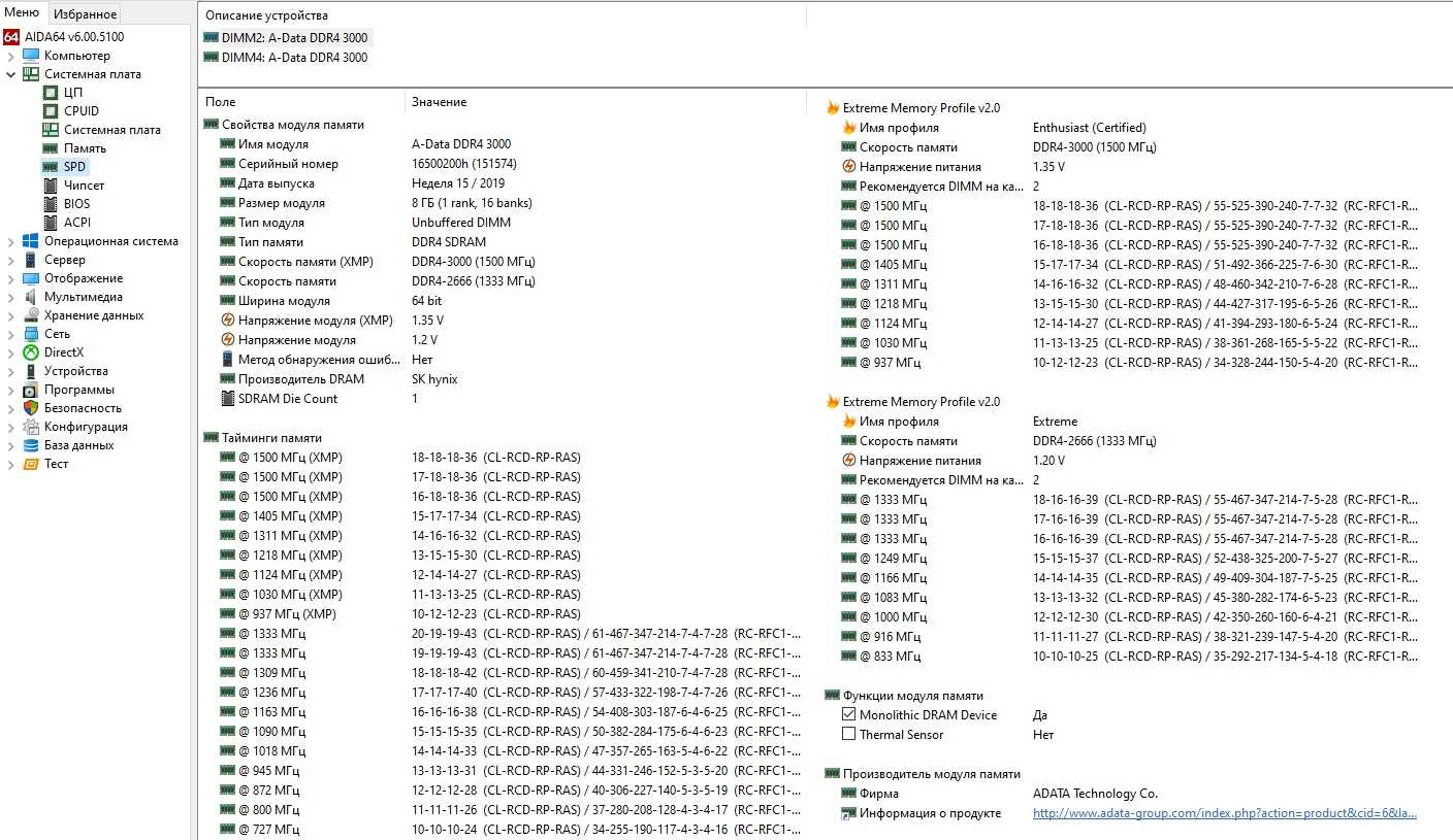 В ADATA AX4U300038G16-BBG установлены чипы Hynix (одностороннее размещение) плотностью 8 Гбит, произведенные по 20-нм техпроцессу с маркировкой H5AN8G8NAFR-VJC. Это типичный представитель памяти с номинальной частотой 2666 МГц A-die. Согласно спецификациям, память ADATA поддерживает профиль XMP 2.0 с таймингами 16-18-18-36-2Т. Кроме профиля XMP в памяти в SPD остальные банки пустые. Другими словами, материнская плата должна самостоятельно определить частоту и тайминги при первом включении. Это второй недостаток, который мы обнаружили.