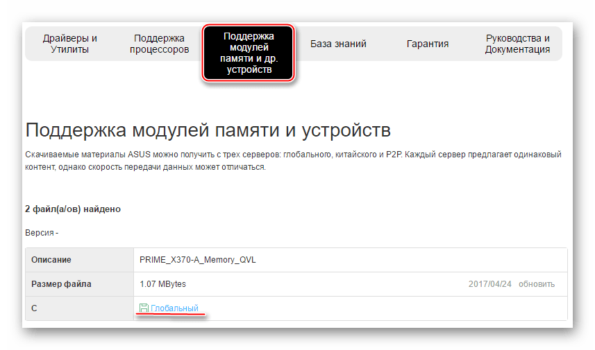 Вторая же вкладка содержит в себе ссылки на скачивание таблиц, в которых представлен список поддерживаемых производителей и модулей памяти. Чтобы перейти на страницу со ссылками на скачивание нужно в меню выбрать «Поддержка модулей памяти и др устройств».