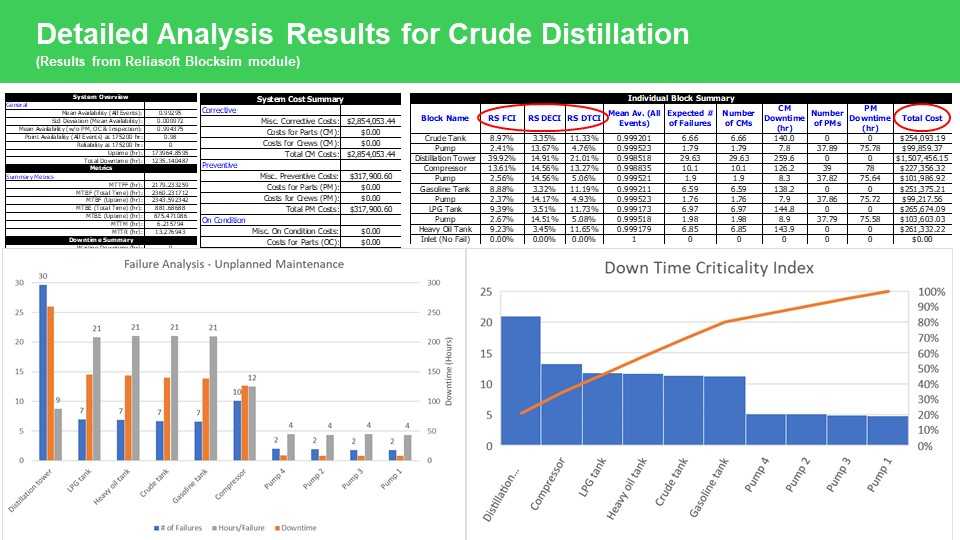 Анализ основывается на системной конфигурации (представленной диаграммами) элементов и таких свойствах, как «Отказ» и «Продолжительность ремонта». Отказ определяет частоту возникновения отказа каждого актива, а Продолжительность ремонта – время простоя. На основе системной конфигурации рассчитывается эффект, оказываемый на всю систему. Эффект может заключаться в выходе всей системы из строя или в процентном сокращении общего объема производства.