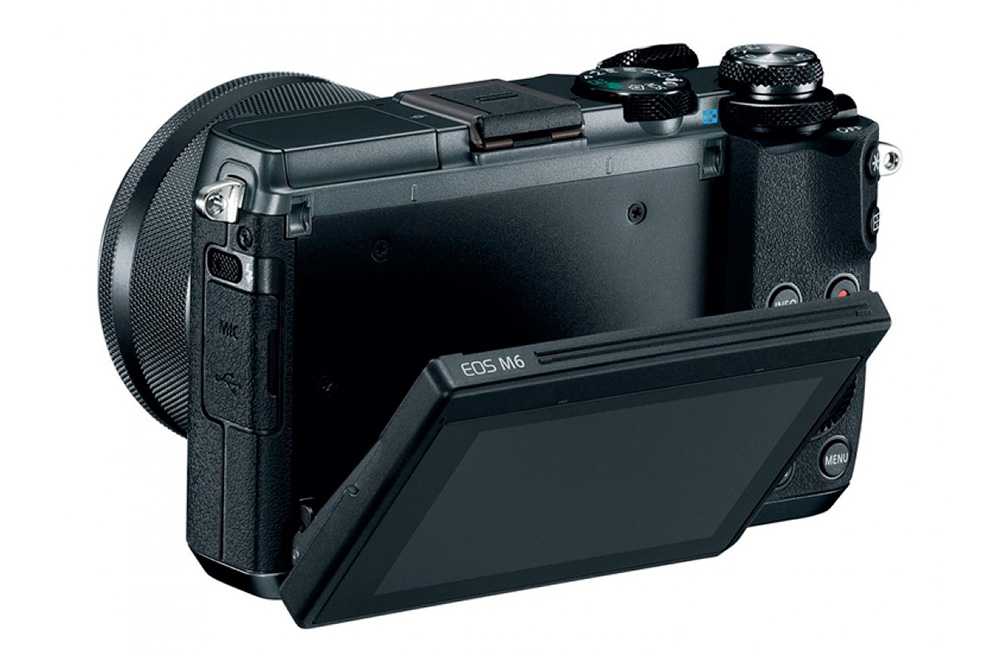 Вот три самых главных отличия. Во-первых, корпус EOS M6 вместо металлического сплава теперь по большей части состоит из пластика. Несмотря на это, выглядит он дорого и является удобным. Во-вторых, откидной сенсорный дисплей, расположенный на задней стороне, теперь по диагонали насчитывает 3 дюйма вместо 3,2 дюймов, а разрешение у него составляет 1,04 млн субпикселей вместо 1,62 млн субпикселей. Впрочем, для использования в качестве видоискателя его будет абсолютно достаточно.