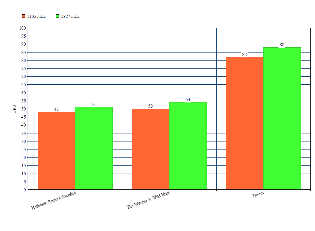 Чтобы проверить практическую пользу скоростных модулей в играх, мы протестировали производительность системы в различных частотных режимах, для информативности добавив показатели платформы с памятью DDR4-2666 (15-17-17-36).
