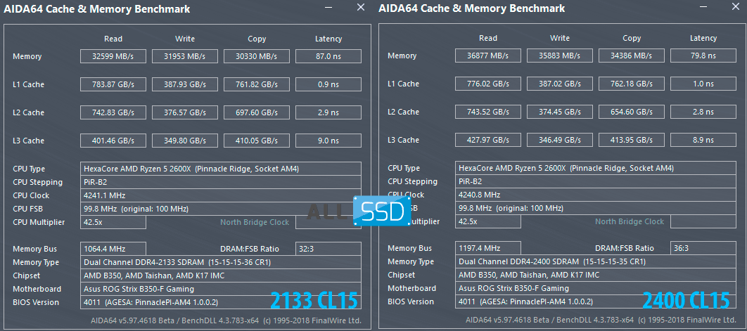 Уровень задержек составляет 87 нс при 2133 МГц, доходит до 79,8 нс во время работы профиля XMP и остается равен 72,4 нс при разгоне. Чем меньше общие задержки, тем быстрее будет работать память. Впрочем, все это лишь теоритические показатели, а как на самом деле?