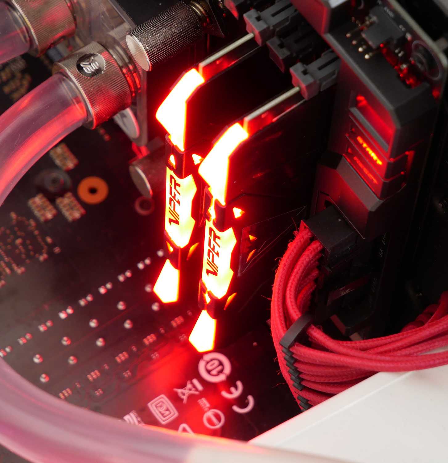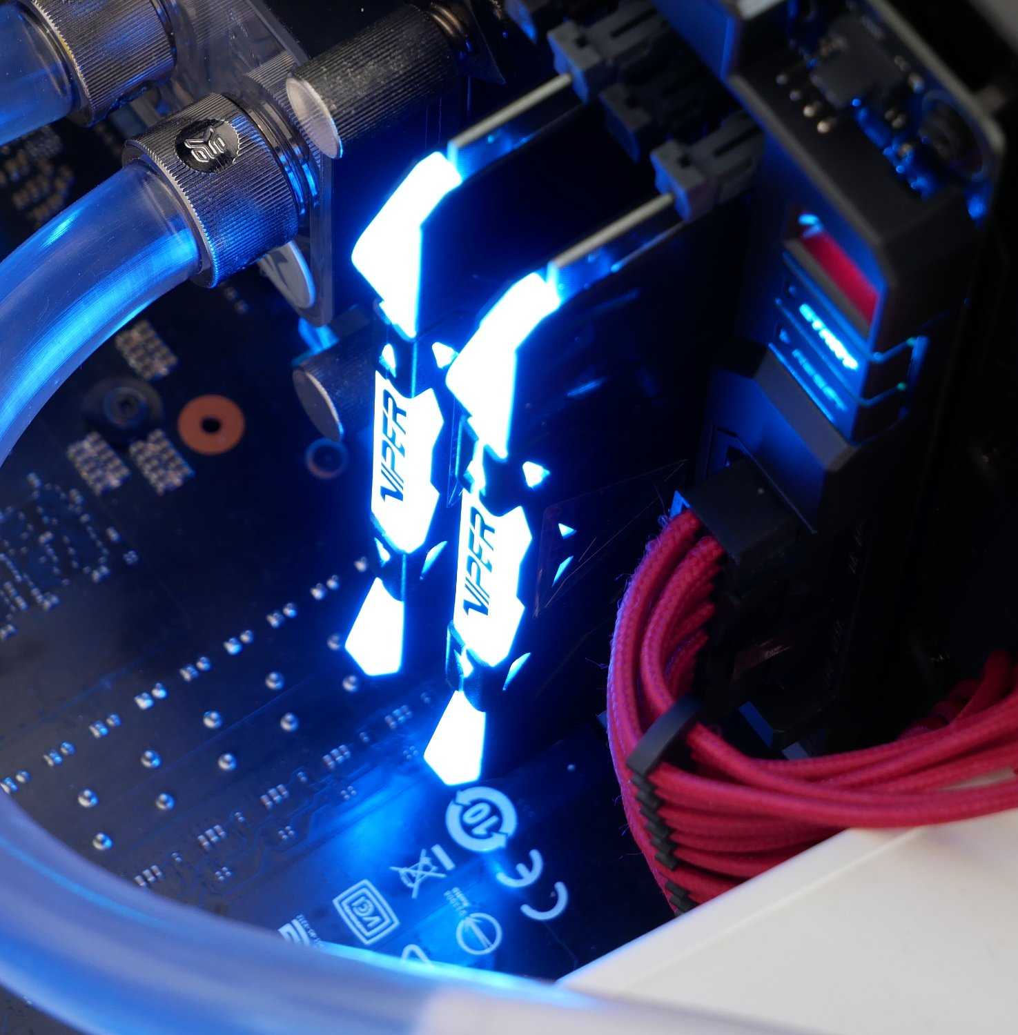 Вне зависимости от точки обзора подсветка Patriot Viper RGB 3600 МГц выглядит великолепно. На примере материнской платы ASUS Z370 ROG Maximus X Formula данный набор отлично вписывается в итоговую систему и синхронно управляется вместе с остальными компонентами.