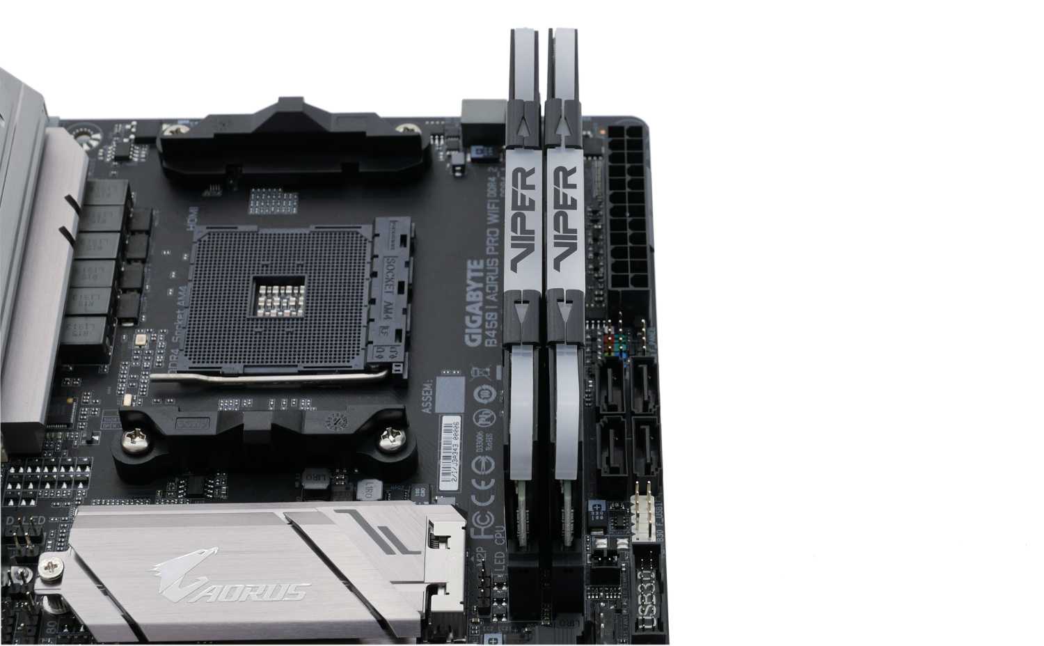 Черно-серое исполнение оперативной памяти Patriot Viper RGB 3600 МГц 2х8 Гб лучше всего вписывается к соответствующей материнской плате, в данном случае — Gigabyte B450 i Aorus Pro WiFi.