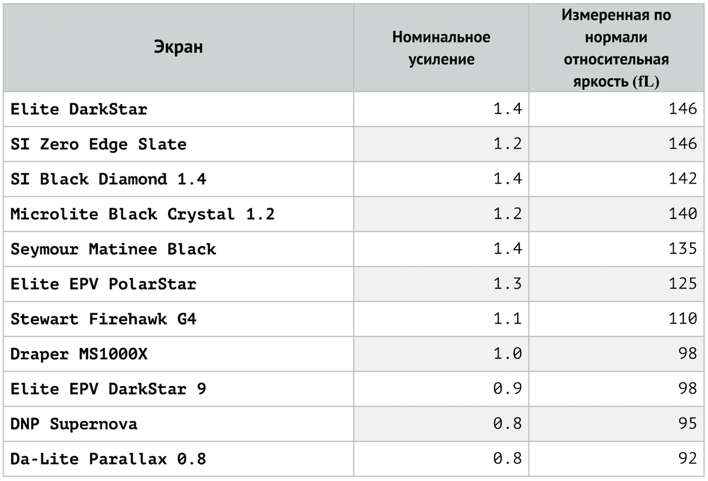 ** Только для сравнительных целей. Данные отношения показывают возможности экранов при конкретном типе засветки и конкретном проекторе. Измеренные величины не связаны напрямую со спецификациями экранов.