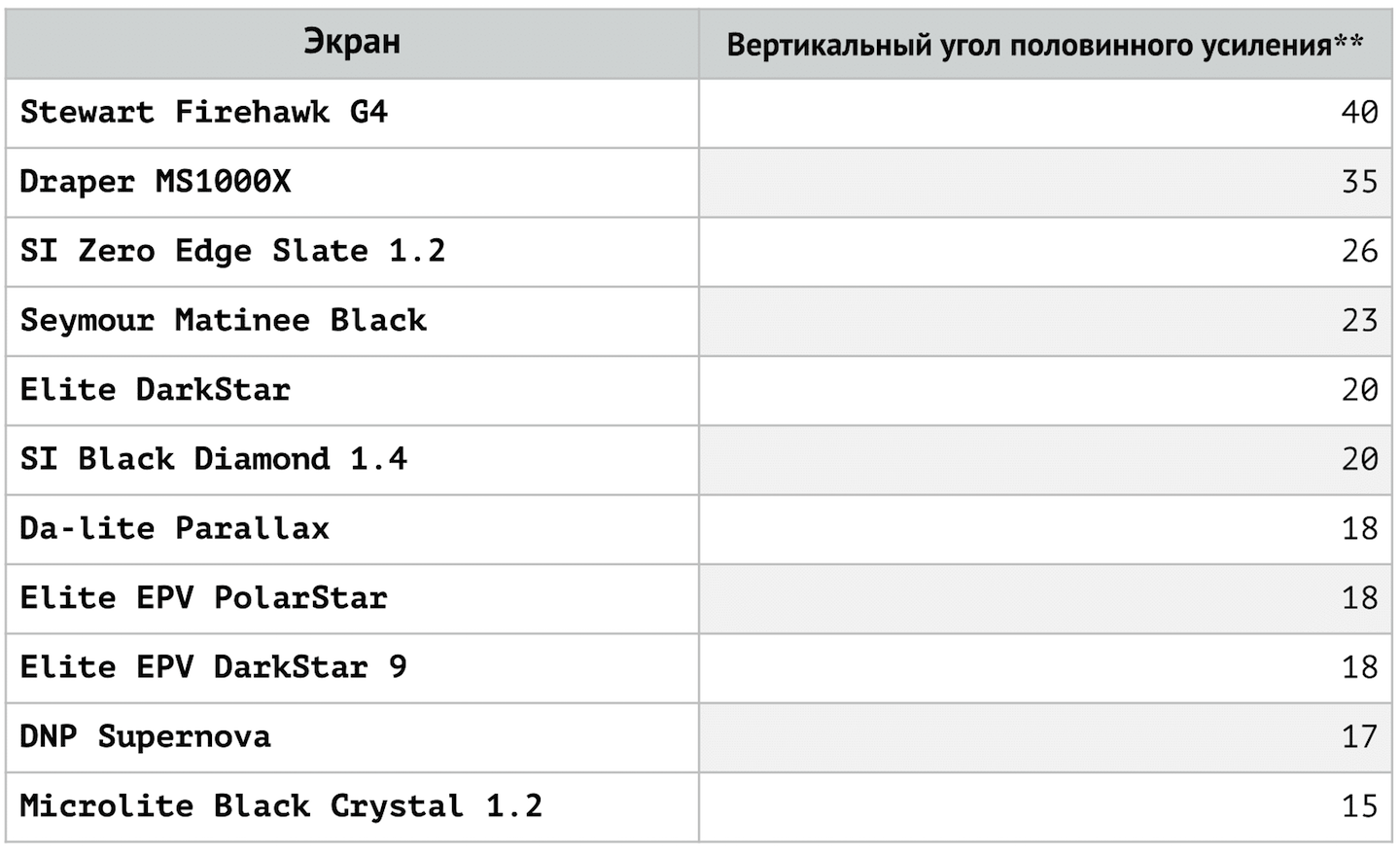 Мы не зря, дав определения угла половинного усиления, оставили ремарку — «как правило, в горизонтальной плоскости». Теперь очередь дошла и до вертикальной. Мы нисколько не ограничиваем вашу фантазию, но сомневаемся, что вы будете строить кинозал-амфитеатр, когда галерка взирает на экран высоко сверху, а партер, задрав головы, будто из оркестровой ямы, весь сеанс тренирует шейные позвонки. Здесь речь о другом. Вертикальный обзор важен для оценки потолочной засветки и критически важен для корректной работы рефлекторно-офсетной проекции. Сейчас появились кинотеатральные проекторы (например, Sony VPL-GTZ1), инсталлируемые либо под, либо над экраном: они посылают на экран кинжально-плоский луч света — фактически вдоль полотна. Производить контрастные экраны для таких случаев умеют только самые именитые и опытные компании.