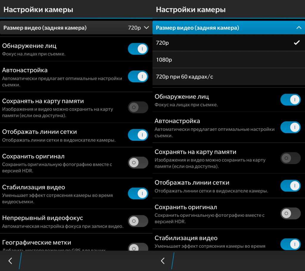 Настройки камеры — Обнаружение лиц, Автонастройка, Сохранение снимков на карту памяти, Отображение линий сетки, Сохранить оригинал, Непрерывный видеофокус, Геотеги изображений.