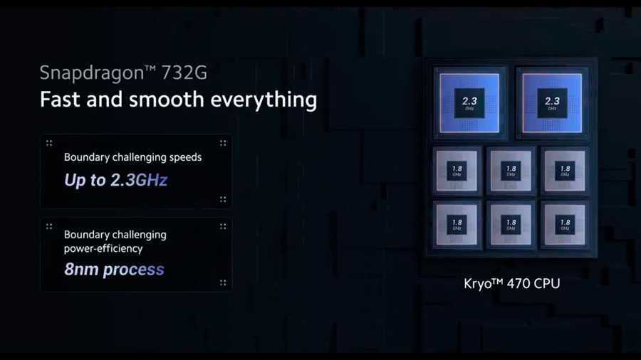 Для смартфона Redmi Note 10 Pro остановились на мобильной платформе Qualcomm Snapdragon 732G, где литера G указывает на «игровую» специфику. В конфигурацию кластеров входят два производительных ядра Kryo 470 Gold и шесть энергоэффективных ядер Kryo 470 Silver, причем тактовая частота первых двух достигает 2,3 ГГц. Графический ускоритель остался такой же, как и у Snapdragon 730G — Adreno 618, но его производительность увеличилась на 15%. Кроме того, на кристалле, изготовленном с учетом проектных норм 8-нм, реализовали LTE-модем X15 и модуль беспроводного соединения Wi-Fi 6 (802.11ax). В составе платформы предусмотрели еще сигнальный процессор DSP Hexagon 688 и процессор обработки изображений Spectra 350. Базовую конфигурацию Redmi Note 10 Pro дополняют 6 ГБ или 8 ГБ оперативной памяти LPDDR4Х.