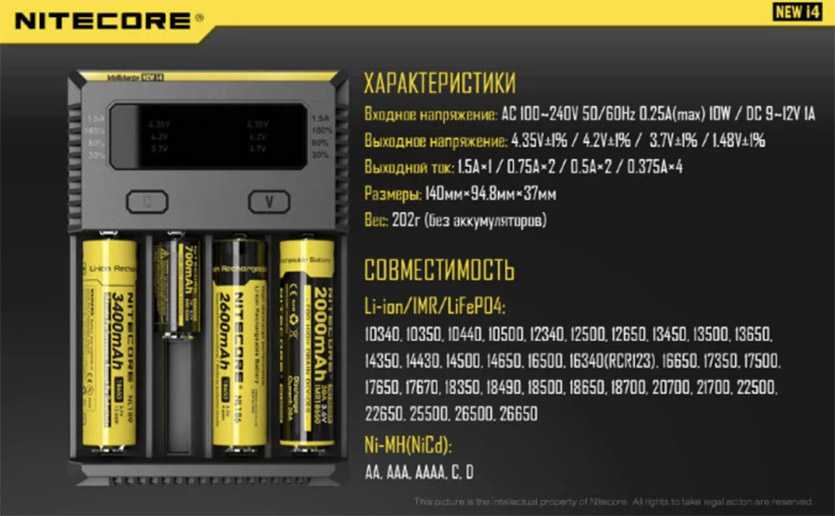 Встроенный микропроцессор автоматически определяет тип установленного элемента питания и подаёт на него необходимое напряжение, до тех пор, пока аккумулятор не зарядится до 100%.