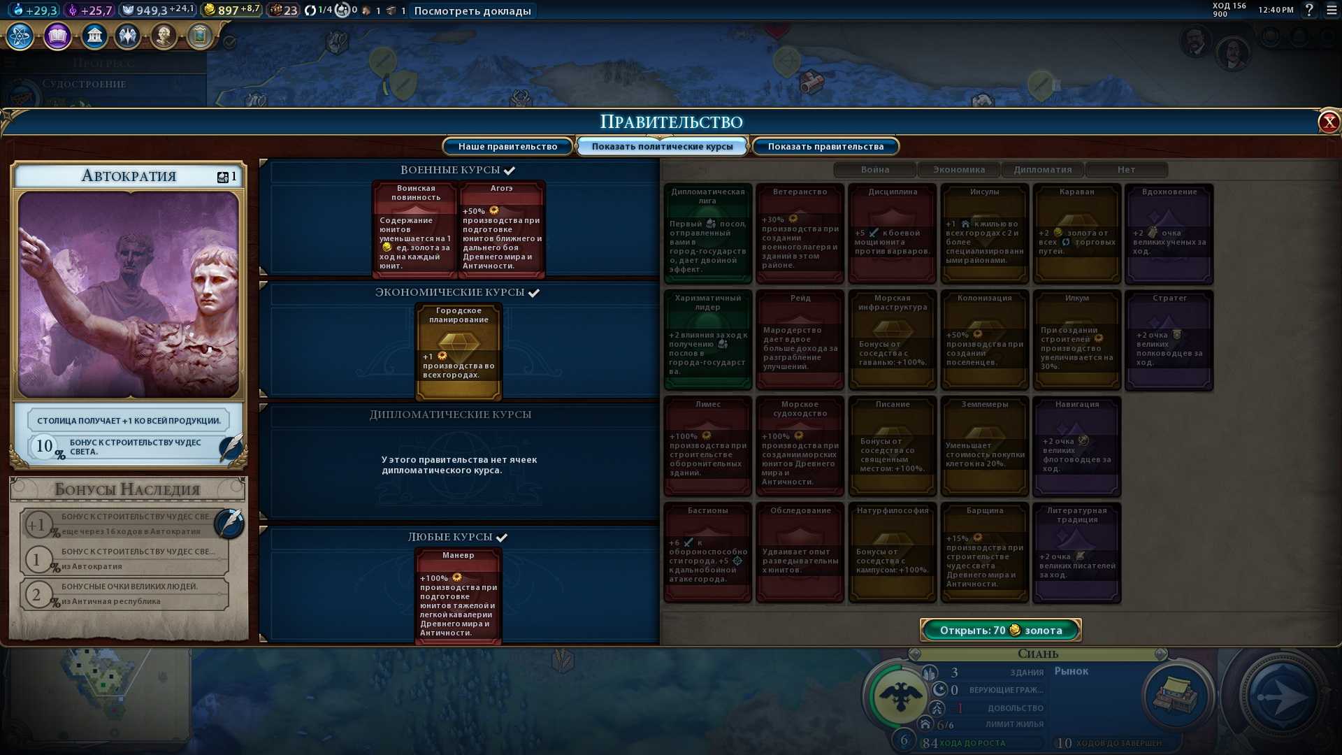 Очень важно правильно подбирать правительство и политический курс в экономике, военном деле и науках, особенно на начальных этапах игры. Так можно ускорить прогресс в любых областях, пока игроку это будет необходимо
