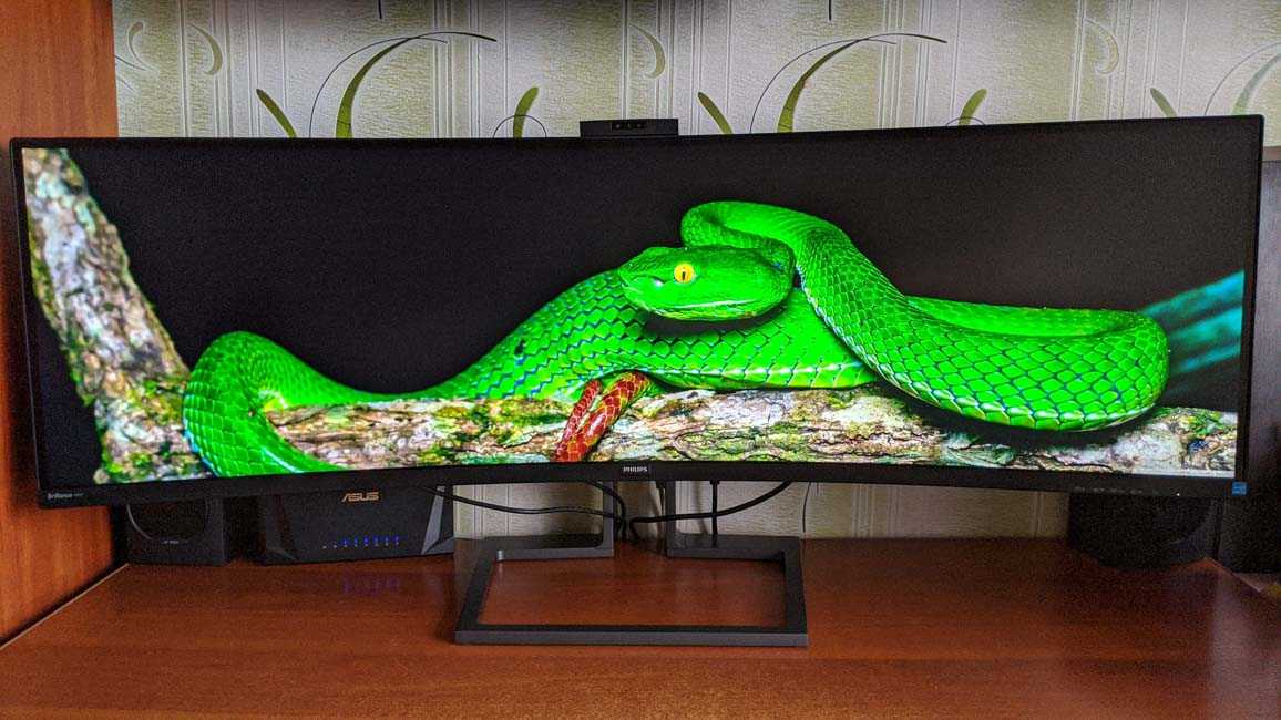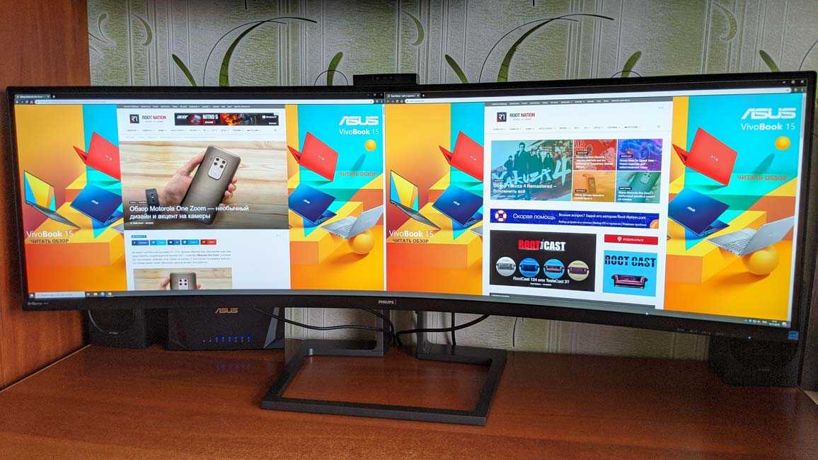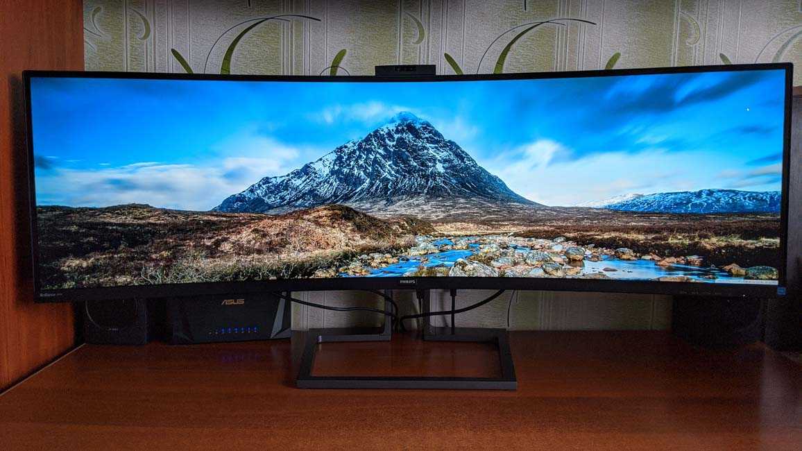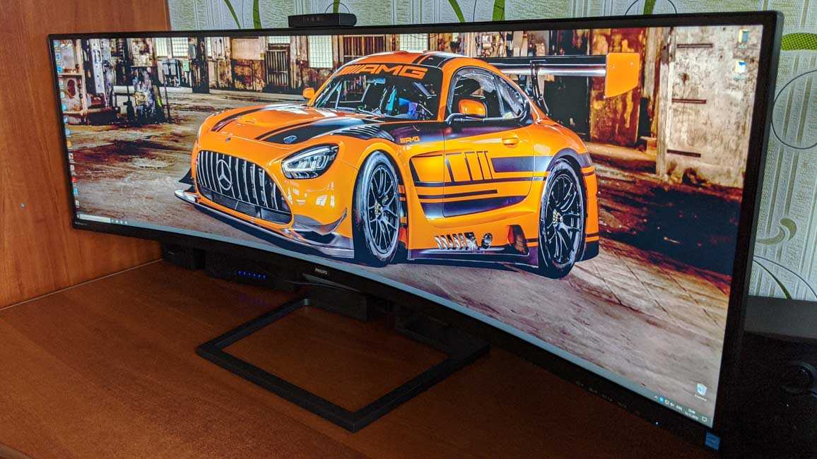 Точная диагональ видимой рабочей области дисплея — 48,8″. Соотношение сторон нетипичное, а широкоформатное — 32:9, и при разрешении Dual Quad HD (5120×1440 пикселей) мы получаем плотность в 109 ppi. Вроде бы и не очень много, но надо учитывать диагональ — сидеть близко перед таким монитором вы точно не будете. Ну а на нормальном расстоянии — всё выглядит четко.