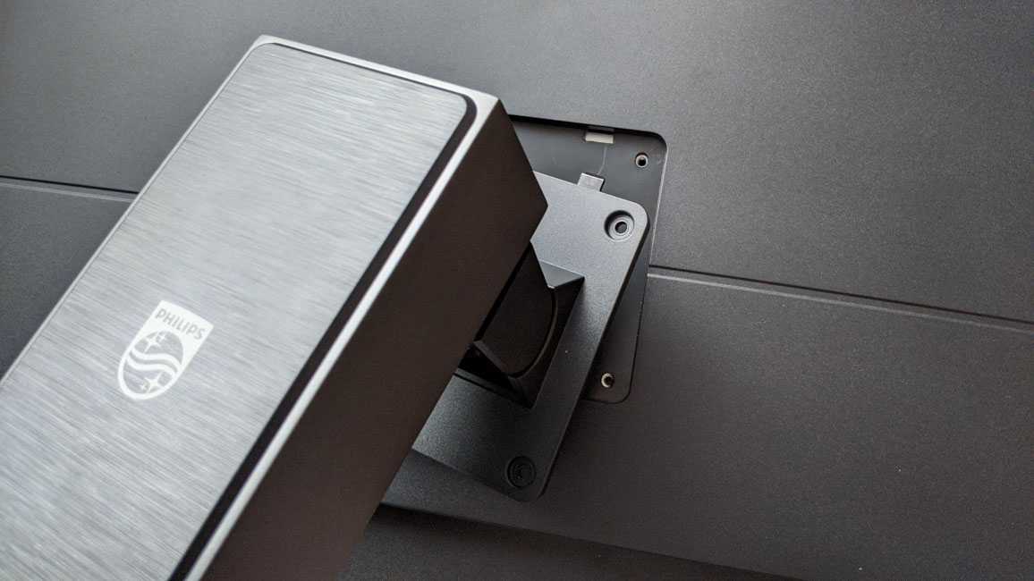 Сверху, как и в Philips 329P9H/00, есть выдвижной элемент — блок веб-камеры с дополнительными сенсорами и микрофонами. В спрятанном виде выступающих элементов не будет. Сзади нет ничего особенного, типичный матовый пластик, вырезы для охлаждения и крепление VESA 100×100 мм в центре.