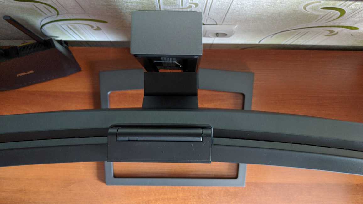 Подставка-основание имеет форму круга с одной срезанной плоской стороной спереди. Внешне из черного матового пластика, без какой-либо фактуры. Ножка изогнутой формы, немного наклоненная в сторону, спереди панель из серого матового пластика, сзади — из черного. В ней есть вырез для вывода кабелей подключения, а дополнительно их спрятать помогут пара крючков сзади