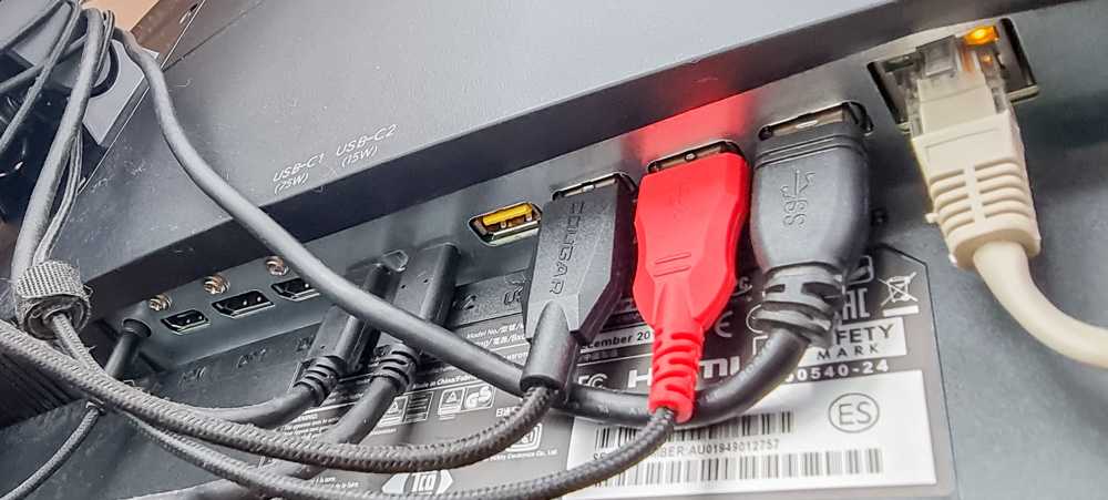 При этом к самому монитору у меня подключены: проводные наушники, клавиатура с мышкой, первый внешний HDD на 1 ТБ (через порты USB-A), второй внешний HDD на 4 ТБ (через Type-C) и кабель от роутера через порт RJ-45. То есть, мне достаточно отключить один кабель от ноутбука, чтобы забрать его в поездку, а по возвращению просто снова подключить лэптоп одним кабелем к монитору, чтобы восстановить полноценное рабочее место за домашним столом.