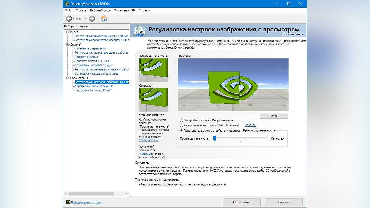 - Передвинуть «ползунок», который находится ниже, в крайнюю левую позицию «Производительность»;
