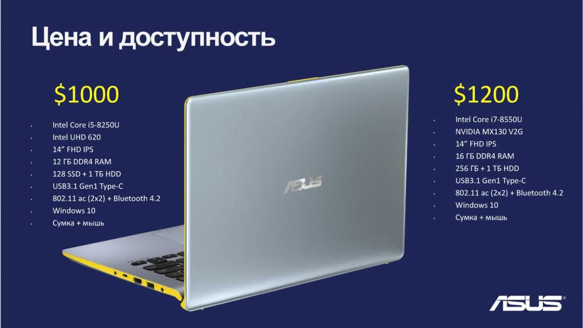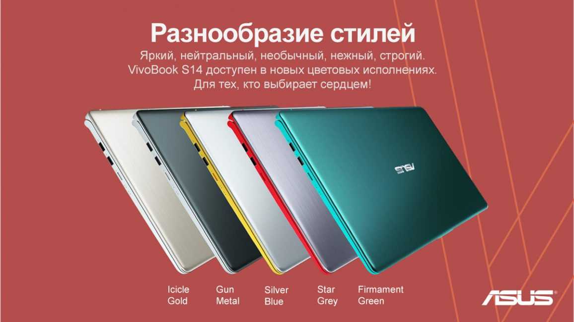 VivoBook S. Линейка ультрабуков весом 1,2-1,8 кг с экранами по 13,3-15,6 дюймов, обрамленными тонкими рамками. Вошли в число лучших ноутбуков Asus 2019 года по продолжительности автономной работы: батареи устройств, которые можно без усилий удерживать одной рукой, снабжают лэптопы энергией до 12 часов подряд. Высокая производительность этих компактных устройств возможна благодаря ЦПУ Core i3/5/7, мощным видеокартам Intel или Nvidia, жестким дискам объемом 1-2 ТБ, SSD-накопителям или комбинации обоих вариантов. Кроме элегантного дизайна стоит отметить расцветку корпусов: кроме привычного серого и светло-серебристого выпускаются модели золотистого, синего и зеленого цвета.