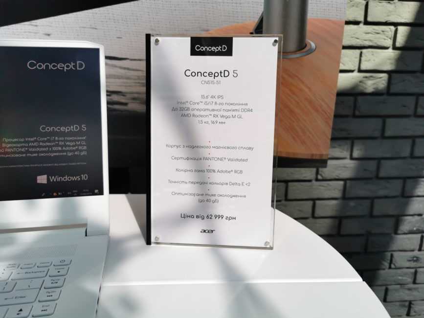 Самым доступным решением станет ConceptD 5. Хотя как, доступным… $2000 в минимальной комплектации — это вам не это. Зато в этом лэптопе имеем 4К IPS дисплей с цветовым покрытием sRGB 100%, керамическим корпусом, процессором Intel Core 8-го поколения, с видеоядром Radeon Vega M GL, до 16 ГБ ОЗУ и до терабайта PCIe SSD. Вес ноутбука — всего 1,5 кг