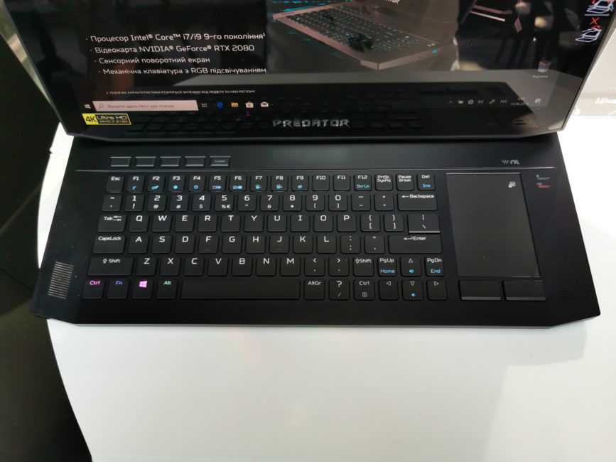Модели Acer Predator Helios 700 и Acer Predator Triton 900 уже поинтереснее. Главная фишка первой — сдвигающаяся вперёд клавиатура HyperDrift с особыми переключателями MagForce, которые реагируют на глубину нажатия (как газ в автомобиле). Кроме того, открытая клавиатура улучшает процесс охлаждения ноутбука и делает доступным разгон процессора и видеокарты. А стеклянная область подсвечивается переливающимися голубоватыми и красными гексагонами.