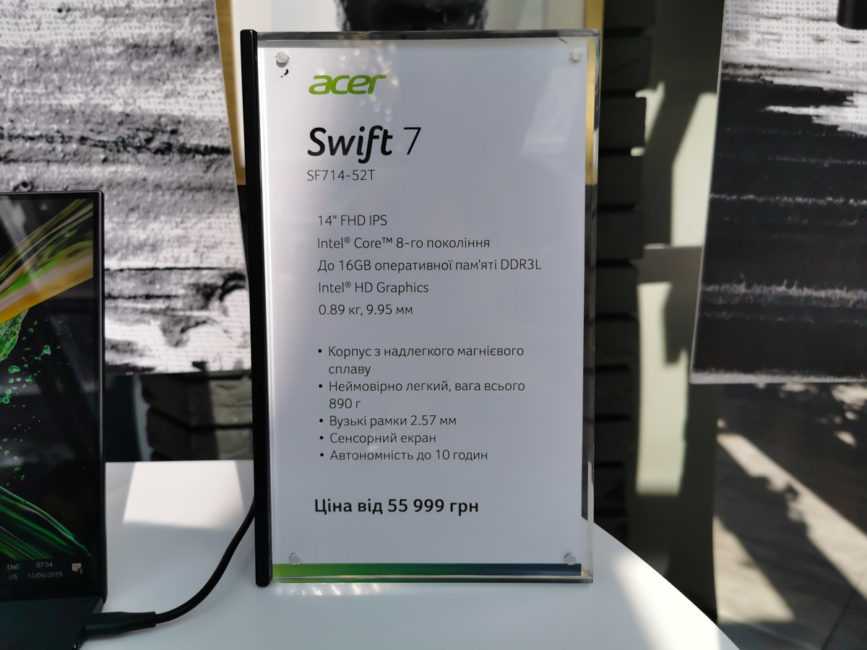 Цена Acer Swift 3 — 19999 гривен в минимальной комплектации. Цена Acer Swift 7 — 55999 гривен в минимальной комплектации.