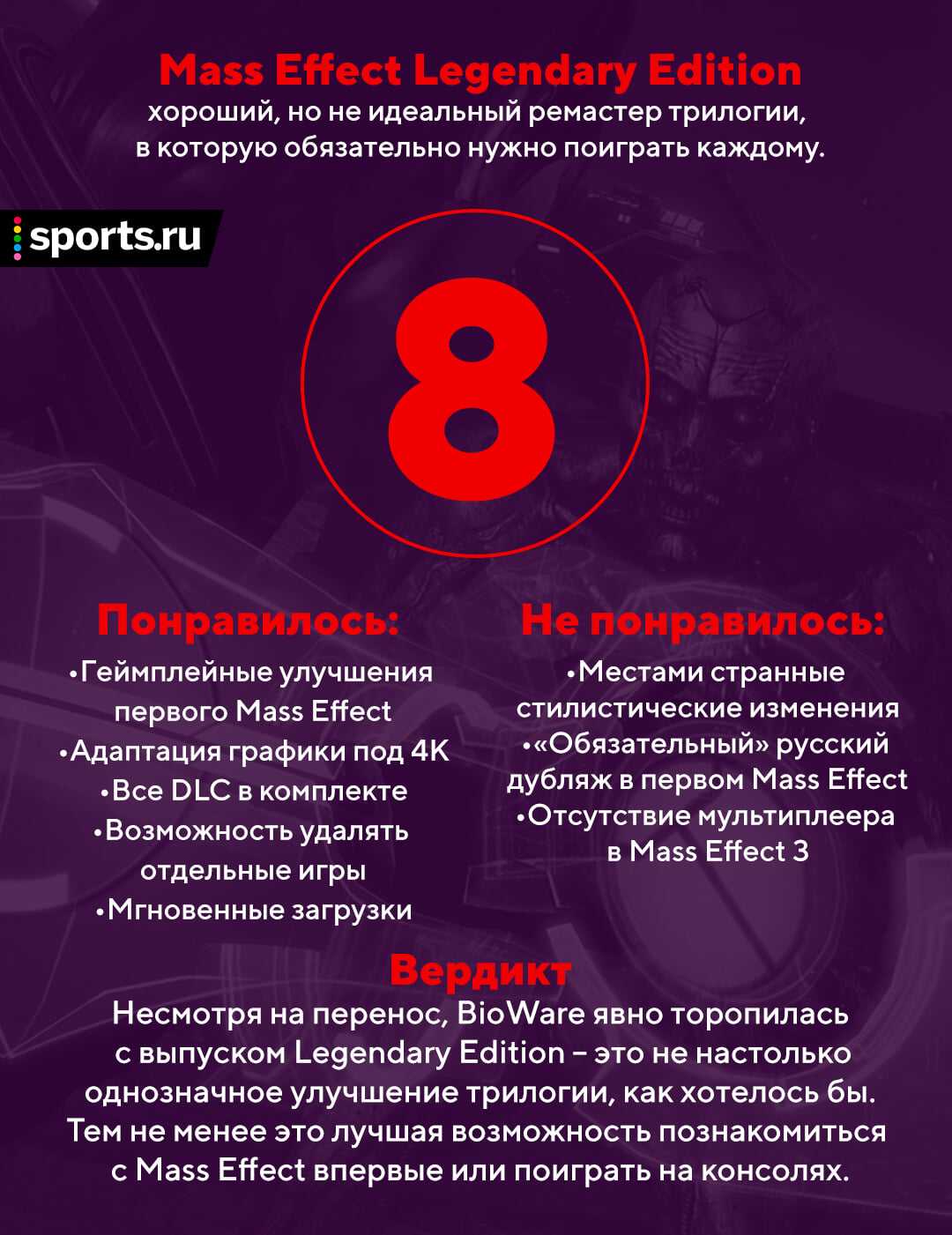 Конечно, Mass Effect Legendary Edition можно было сделать лучше (даже не говоря о несбыточной мечте о полном ремейке), но это в равной степени отличный повод пройти трилогию еще раз и идеальная возможность наконец лично познакомиться с одной из самых влиятельных игровых серий современности. Надеемся, разработчики исправят недоразумение с «обязательным» русским дубляжом в ближайшее время – это единственная причина если не избегать, то как минимум отложить приобретение ремастера.
