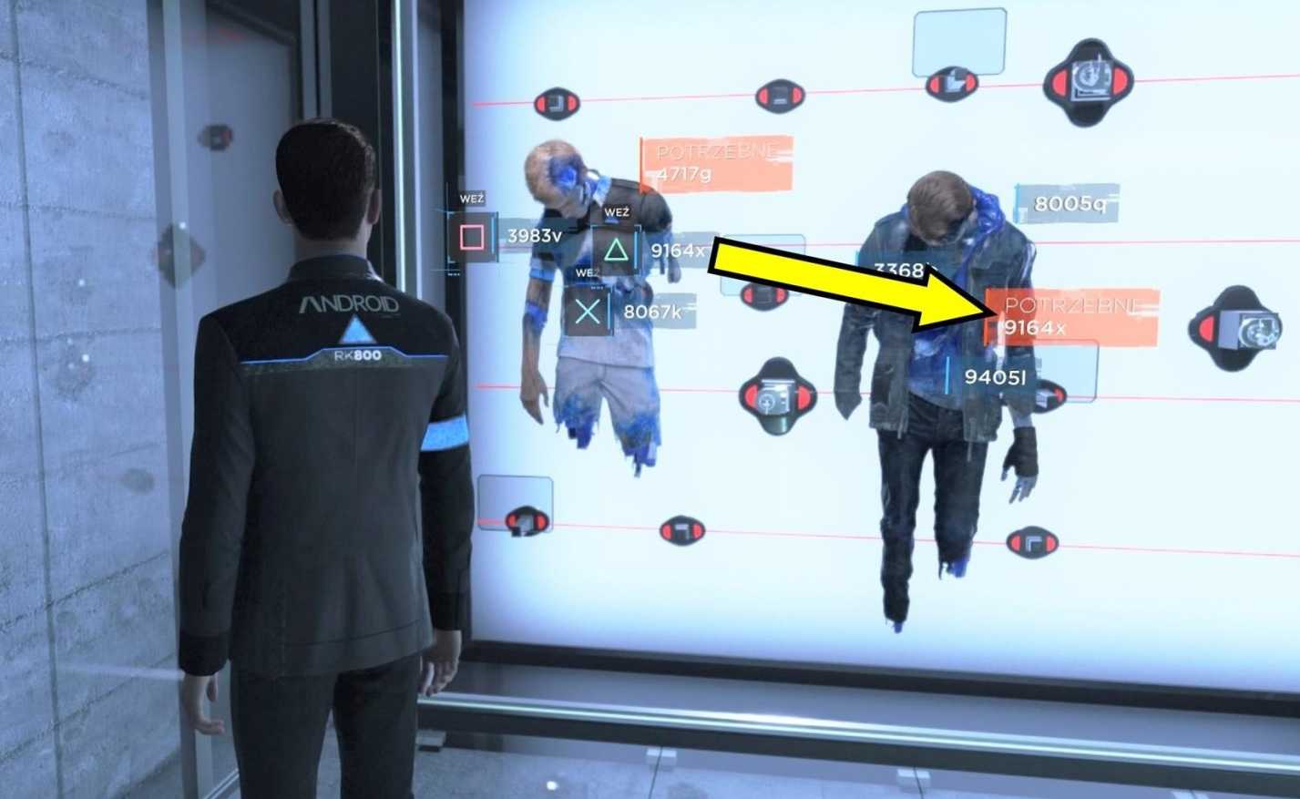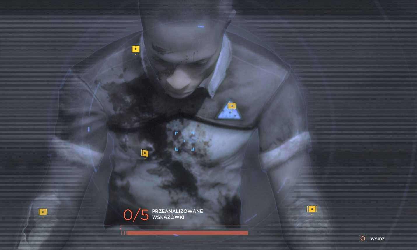 Прежде чем сесть в кресло, подойдите к столу и посмотрите на файл / фотографии (2), лежащие на прилавке. Тогда сядь перед девиантом. Прежде чем допрашивать его, проанализируйте андроид (3). Найдите пять следов: ушиб на лбу (разблокируется диалог), шов и засохшую кровь на комбинезоне, следы ударов на левом плече (разблокируется диалог) и ожоги на правом плече. Благодаря этому вы сможете проанализировать уровень стресса (4) и раны (5).