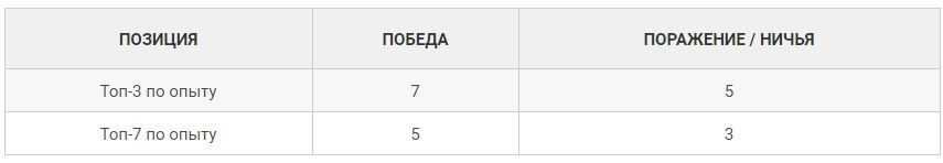 - Топ-3 по опыту в команде — 7 очков за победу, 5 за поражение/ничью.
