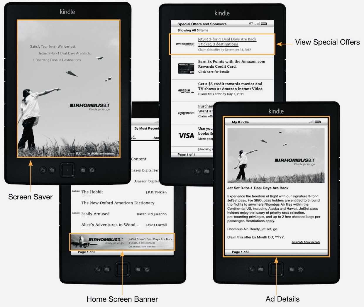 Первый, к примеру, стоил всего 79 долларов, если взять версию со встроенной рекламой. Да, в Amazon придумали такую фишку: показывать рекламу на выключенном экране (E Ink так умеет) и в меню. За это покупателям Kindle полагаются скидки.