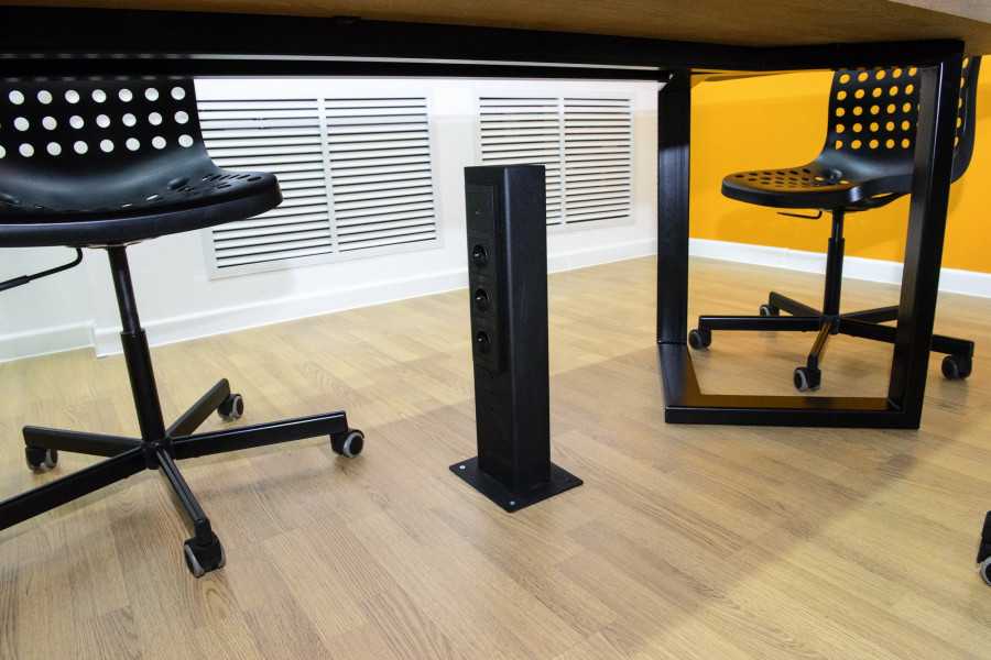 Чтобы спрятать провода,которых в IT-компании по понятным причинам особенно много,Иван Оленченко придумал собственное решение — «башни» с розетками.
